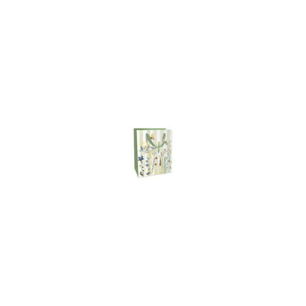 Kompakte Flaschentragetasche Blumenwiese in elegantem Mattgrün mit glänzender Heißfolienveredelung. Mit den handlichen Maßen von 15 x 12 x 6 cm eignet sie sich ideal für kleine Flaschen oder Mini-Geschenke. Aus stabilem 170 g/m²-Papier gefertigt und mit liebevollem floralen Design – perfekt für besondere Aufmerksamkeiten mit Stil.