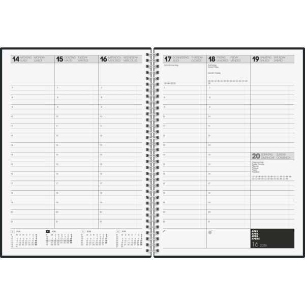 Der Buchkalender bietet auf 144 Seiten eine übersichtliche Darstellung Ihrer Woche: Sie haben für jeden Tag ausreichend Platz, um Termine, Aufgaben und Notizen festzuhalten. Die praktische Wire-O-Bindung sorgt dafür, dass der Kalender flach liegt und einfach zu handhaben ist.