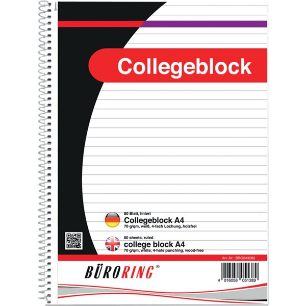 Büroring Collegeblock 543582, Lineatur 21 / liniert, A4, 70g, weiß/schwarz, 80 Blatt