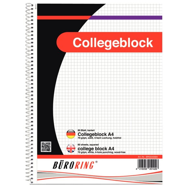 Jetzt Büroring Collegeblock 543584, Lineatur 22 / kariert, A4, 70g, weiß/schwarz, 80 Blatt günstig kaufen.