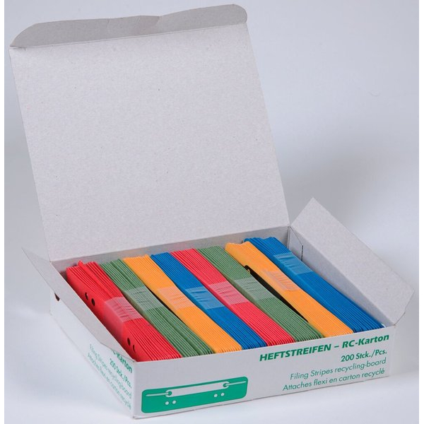 Die Heftstreifen kurz bestehen aus hochwertigem Recycling-Karton und verfügen über eine stabile Metalldeckleiste, die für sicheren Halt sorgt. Mit einer praktischen Lochung von 6 cm und 8 cm eignen sich diese Streifen perfekt für DIN A5 und A4 Unterlagen. Dank ihrer farbigen Sortierung, die Blau, Rot, Grün und Gelb umfasst, bringen sie auch Farbe in jedes Büro.