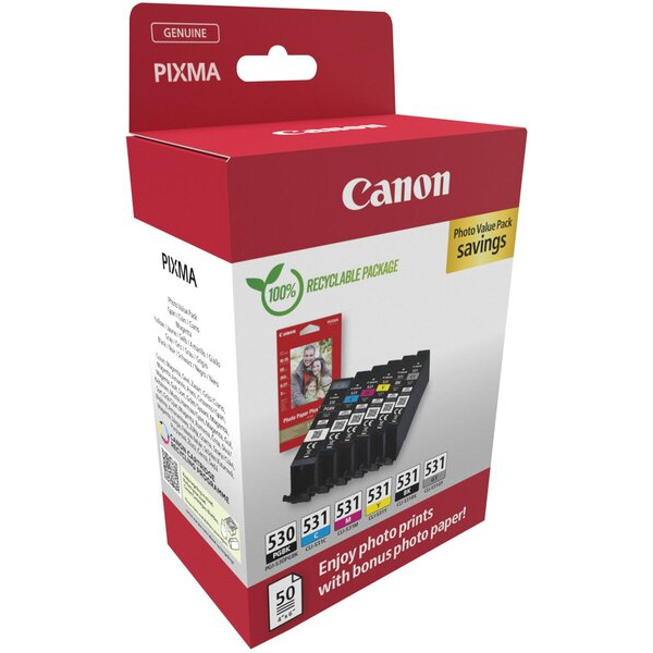 Canon Tintenpatrone Multipack PGI-530 und CLI-531 plus Papier, für Canon Drucker, 1 x 18,5 ml, 5 x 8,5 ml, fotoschwarz, schwarz, cyan, magenta, gelb, grau