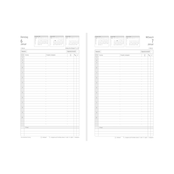 Der Kalender bietet eine Tagesplanung auf jeweils einer Seite, ergänzt durch nützliche Extras wie Jahresplan, Ferien- und Feiertagsübersicht sowie Notizblätter. Weitere Ausstattungsmerkmale sind ein Magnetverschluss, Einklemmband und Stifthalter – perfekt für unterwegs und den Schreibtisch.