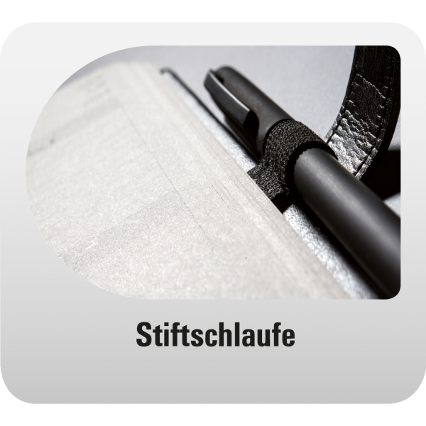 | Stabiles Hardcover aus hochwertigem, schwarzem Lederimitat | |