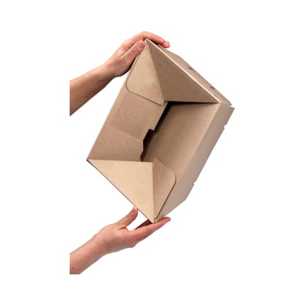 Die Innengröße dieses Kartons beträgt 230 x 160 x 125 mm. Der Blitzbodenkarton verfügt über einen überlappenden Automatikboden, der ein schnelles Aufrichten ermöglicht, während der selbstklebende Verschluss Zeit spart und auf zusätzliche Verschlussmittel verzichtet. Mit dem integrierten Aufreißfaden lässt sich der Karton mühelos öffnen.
