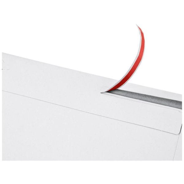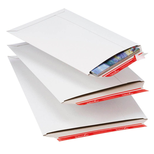 Die Versandtaschen kommen in der eleganten Farbe weiß und bestehen aus robustem Karton. Sie sind mit einem haftklebenden Verschluss ausgestattet, der eine sichere Versendung gewährleistet. Zudem sind sie umweltfreundlich und tragen das FSC-Zertifikat.