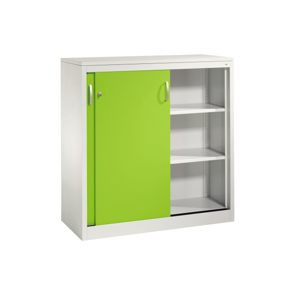 • Frontfarbe: grün • Korpusfarbe: lichtgrau • Material: Stahl/Spanplatte melaminharzbeschichtet • Schiebetüren • abschließbar (Zylinderschloss)