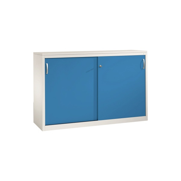 2x2 Fachböden höhenverstellbar, 70 kg Tragkraft/Fachboden, Schiebetüren abschließbar, Mitteltrennwand, Bügelgriff, Abdeckspanplatte, Sichtrückwand
