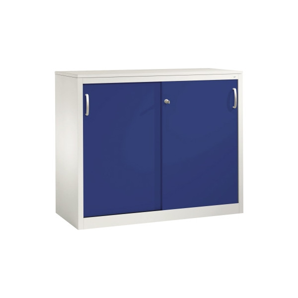 • Frontfarbe: enzianblau • Korpusfarbe: lichtgrau • Material: Stahl/Spanplatte melaminharzbeschichtet • Schiebetüren • abschließbar (Zylinderschloss)
