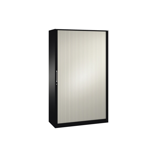 4 Fachböden höhenverstellbar, 70 kg Tragkraft/Fachboden, Rollladentür mit Aluminiumschlossleiste, Sockel mit integrierter Niveauregulierung, Bügelgriff