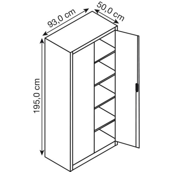 92 cm breit, 195 cm hoch, 50 cm tief, mit verschweißtem Korpus, mit Drehgriff & Zylinderschloss