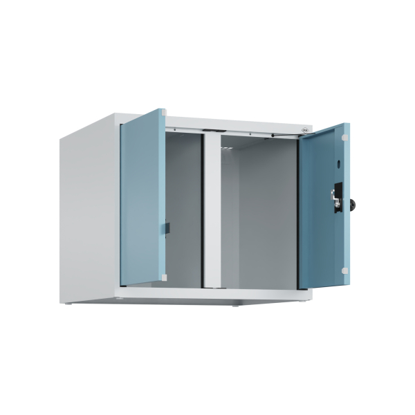 2x2 Fachböden höhenverstellbar, Flügeltüren abschließbar, Mitteltrennwand, Bügelgriff, Sichtrückwand