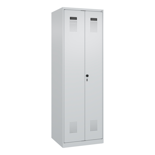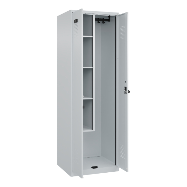 Entdecken Sie den C+P Putzmittelschrank Evolo PLUS mit den Maßen 1850x600x500mm (HxBxT). Dieser vielseitige Putzmittelschrank überzeugt durch seine hochwertige Einbrennbeschichtung, die für hohe UV- und Korrosionsbeständigkeit sorgt. Die geschlossenen und abgeschrägten Seitenprofile ermöglichen eine leichte Innenreinigung und eine komfortable Entnahme von Kleidung und Taschen.