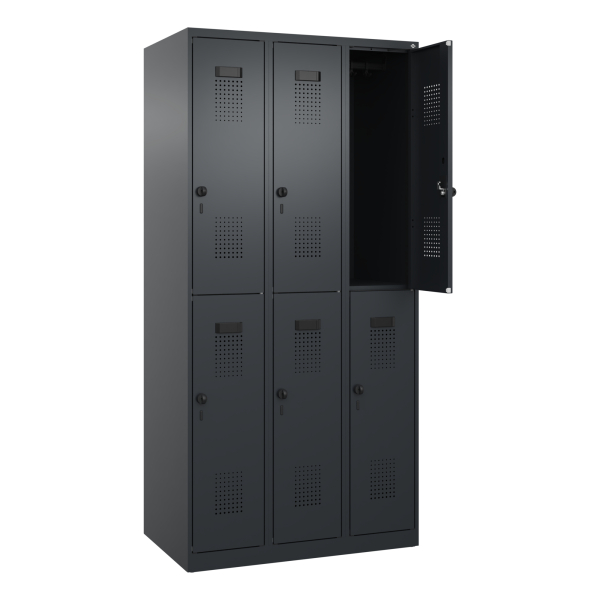 Die geschlossenen und abgeschrägten Seitenprofile sorgen nicht nur für eine ansprechende Optik, sondern erleichtern auch die Innenreinigung und die komfortable Entnahme von Kleidung und Taschen. Zudem ist der Spind für eine verdeckte Kabelführung geeignet und verfügt über hintere Belüftungsöffnungen, die eine optimale Luftzirkulation gewährleisten.