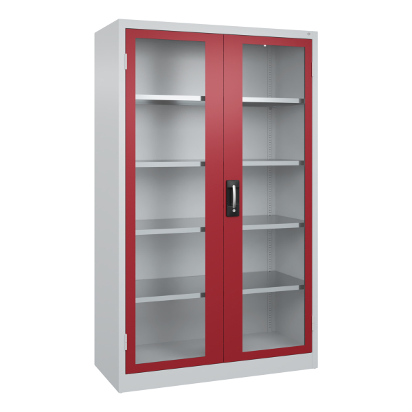 Dank der hochwertigen Verarbeitung und des ansprechenden Designs fügt sich der Schrank problemlos in jede Umgebung ein. Die rubinrote Front sorgt dabei für einen modernen Akzent, während der lichtgraue Korpus für eine zeitlose Eleganz steht. Mit der praktischen Griffmulde ist der Schrank zudem einfach zu öffnen, und das integrierte Zylinderschloss bietet Ihnen die Sicherheit, die Sie benötigen.