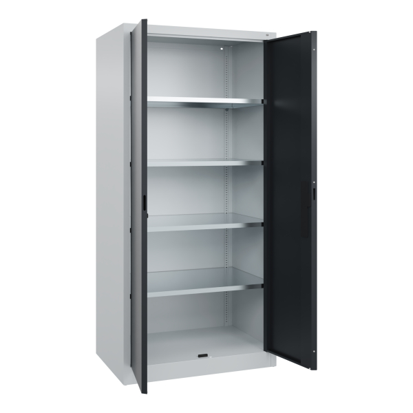 Durch die hohe Flexibilität der Inneneinrichtung lässt sich der Werkzeugschrank individuell anpassen, denn die Fachböden sind in der Höhe verstellbar. Die Türen sind mit geschlossenen Seitenprofilen und verdeckten Schließstangen ausgestattet, was höchste Stabilität und Einbruchsicherheit gewährleistet. Der Softanschlag sorgt zudem für ein sanftes Schließen der Türen. Die Aufhängung der Türen erfolgt oben und unten in Drehbolzen, während die Türen zueinander schlagend für einen gemeinsamen Verschluss konzipiert sind.