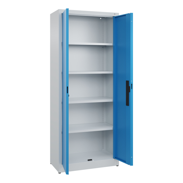 • Frontfarbe: lichtblau • Korpusfarbe: lichtgrau • Material: Stahl • Flügeltüren • abschließbar (Zylinderschloss)