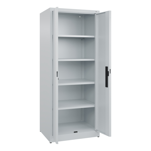 Dieser Stahlschrank bietet Ihnen hohen Komfort dank der praktischen Kunststoffgleiter, die als Schutz für Ihren Schrank und Ihren Fußboden dienen. Durch die Höhenverstellbarkeit im 15 mm Raster können Sie die Inneneinrichtung flexibel gestalten. Die verstärkten Türen sorgen zusätzlich für eine hohe Stabilität, während die spezielle Türaufhängung in Drehbolzen oben und unten für einen gemeinsamen und sicheren Verschluss sorgt.