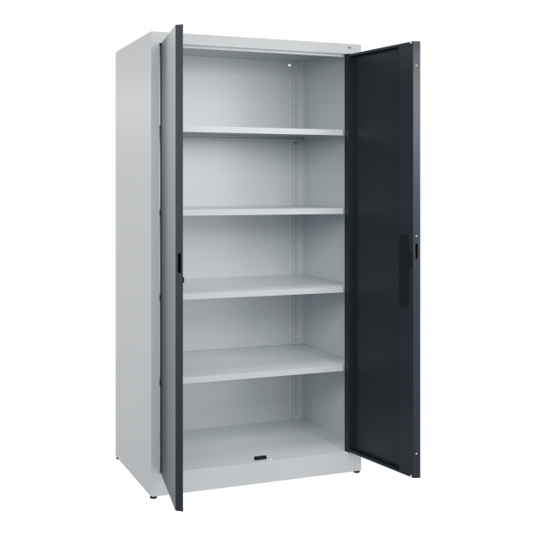 • Frontfarbe: anthrazitgrau • Korpusfarbe: lichtgrau • Material: Stahl • Flügeltüren • abschließbar (Zylinderschloss)