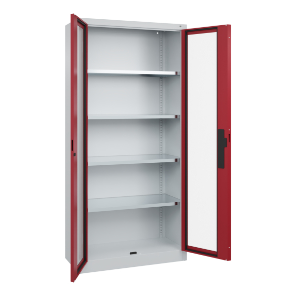 Der Schrank ist mit praktischen Bodengleitern ausgestattet, die sowohl als Schrank- als auch Fußbodenschutz fungieren. Die hohe Flexibilität der Inneneinrichtung wird durch die Höhenverstellbarkeit im Raster ermöglicht, während die Türen mit Sichtfenster aus Acrylglas für einen direkten Einblick sorgen.
