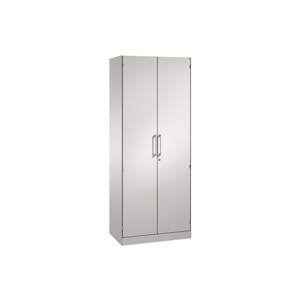 2 Fachböden höhenverstellbar, 70kg Tragkraft/Fachboden, 2 Flügeltüren abschließbar, intigrierter Sockel (8,5cm) mit Niveauregulierung der Sockelfüße, Bügelgriff