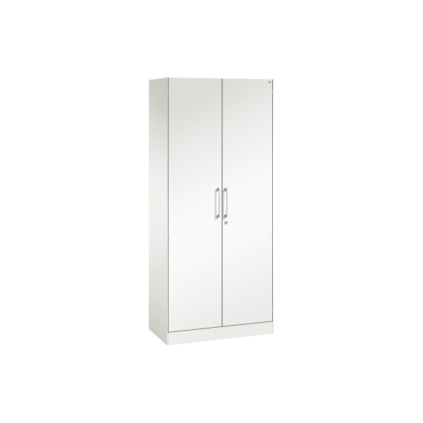 4 Fachböden höhenverstellbar, 70kg Tragkraft/Fachboden, 2 Flügeltüren abschließbar, intigrierter Sockel (8,5cm) mit Niveauregulierung der Sockelfüße, Bügelgriff