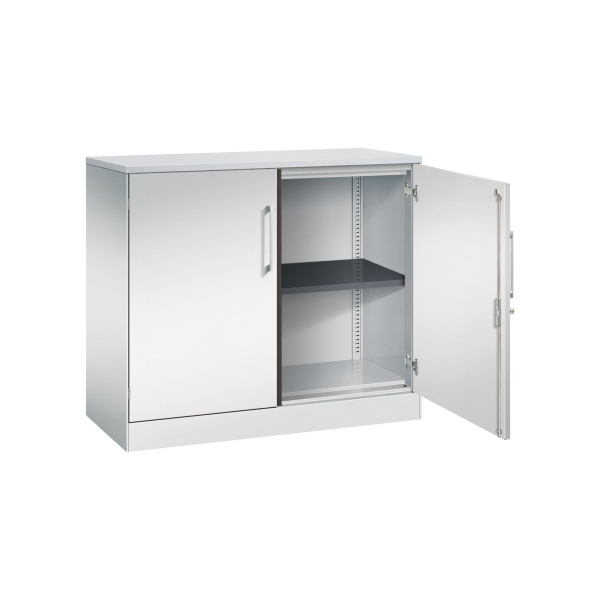 Die integrierte Niveauregulierung ermöglicht eine bequeme Anpassung von innen, während die flexible Inneneinrichtung durch die Höhenverstellbarkeit im Raster für unterschiedliche Anforderungen ausgelegt ist. Mit einer Abdeckplatte aus Stahl und zwei doppelwandigen, gedämmten Stahltüren sorgt dieser Schrank zudem für ein angenehmes Geräuschverhalten. Die Türaufhängung mit innenliegenden Scharnieren bietet einen großzügigen Öffnungswinkel, sodass die Türen zueinander schlagend für einen gemeinsamen Verschluss arbeiten.