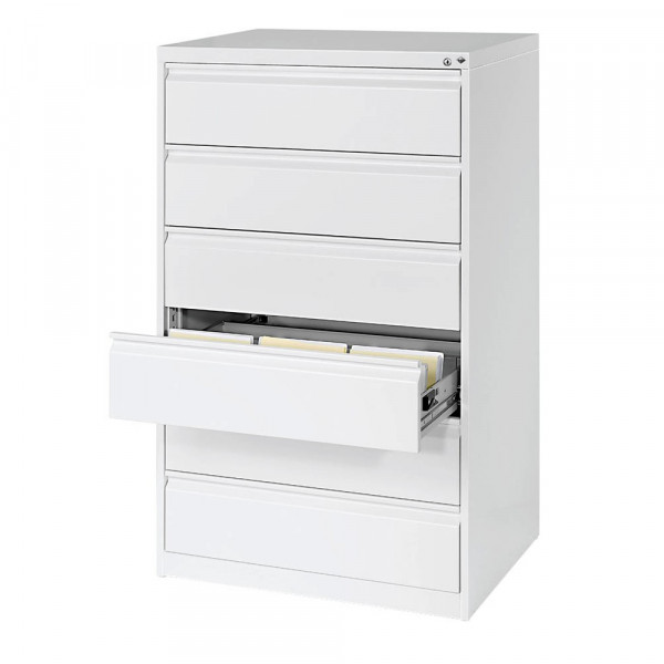 Der Karteischrank verfügt über jeweils zwei verstellbare Pendelbleche pro Bahn und langlebige Teleskopschienen, die einen leichten und reibungslosen Schubladenbetrieb gewährleisten. Ein zentraler Verschluss mit Wechselzylinder, matt vernickelt, sorgt dafür, dass Ihre Dokumente sicher aufbewahrt werden. Bitte beachten Sie, dass die Anlieferungsmöglichkeit durch Sattelschlepper gegeben sein muss.
