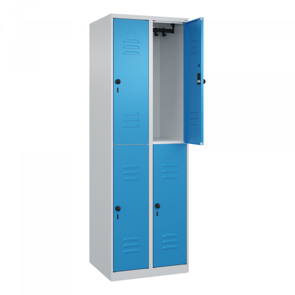 Entdecken Sie den hochwertigen Spind Classic Plus in lichtblau und lichtgrau, Modellnummer 080300-20-S10004. Dieser doppelstöckige Spind bietet Ihnen mit seinen 4 Schließfächern (je 2 Fächer pro Abteil) ausreichend Stauraum für Ihre Utensilien. Der Korpus besteht aus stabiler Stahlkonstruktion und ist mit einer hochwertigen Einbrennbeschichtung versehen, die hohe UV- und Korrosionsbeständigkeit garantiert.