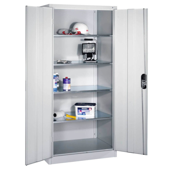 4 Fachböden höhenverstellbar, 70 kg Tragkraft/Fachboden, Flügeltüren abschließbar, Bügelgriff, Sichtrückwand