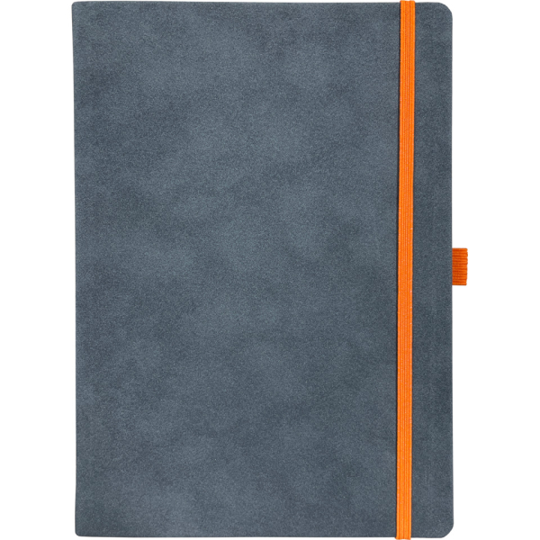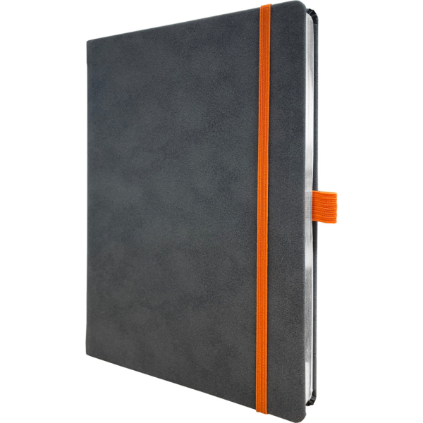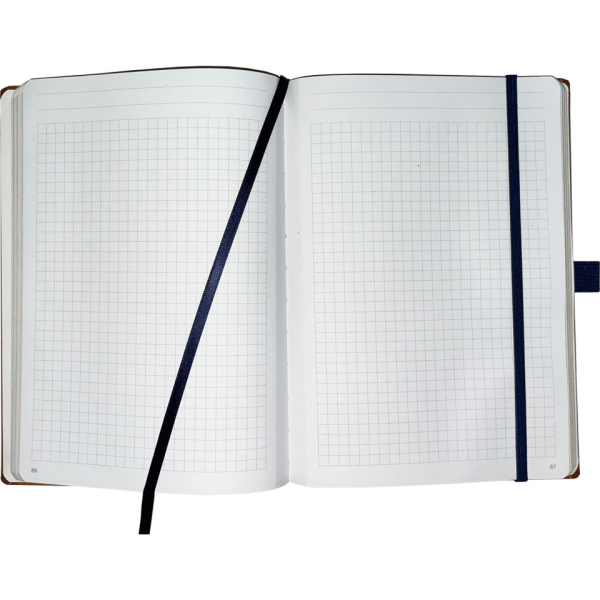 Hochwertiges Notizbuch mit Alcantara-Einband in Cognac und edlem Silberschnitt. Es verfügt über 192 karierte, perforierte Seiten, abgerundete Ecken, Gummiband, Stifteschlaufe, Leseband und eine praktische Einstecktasche – ideal für stilvolles und organisiertes Schreiben.