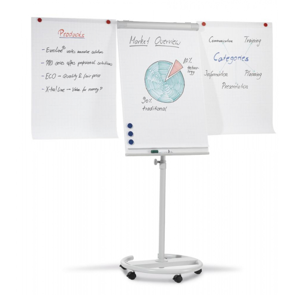 Die Tafel ist beschreib- und trocken abwischbar, was sie zu einer praktischen Wahl für jede Präsentation macht. Mit einem Gewicht von nur 15,5 kg ist das Flipchart leicht zu transportieren und lässt sich dank der stabilen Rollen mühelos im Raum bewegen.