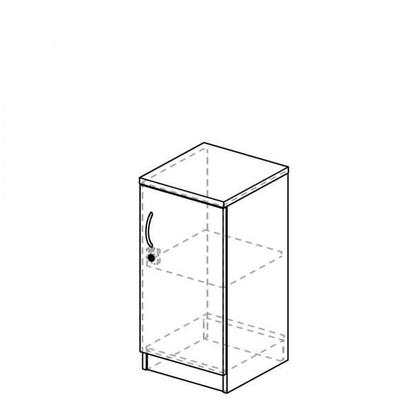 1 Fachboden höhenverstellbar, Flügeltür abschließbar, Bügelgriff, Sichtrückwand, Höhenausgleichsschrauben von innen einstellbar