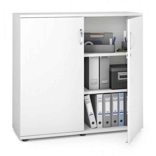 2x2 Fachböden höhenverstellbar, 30 kg Tragkraft/Fachboden, Flügeltüren abschließbar mit Schließdämpfung, Bügelgriff, Mitteltrennwand, Sichtrückwand, von innen einstellbare Möbelgleiter