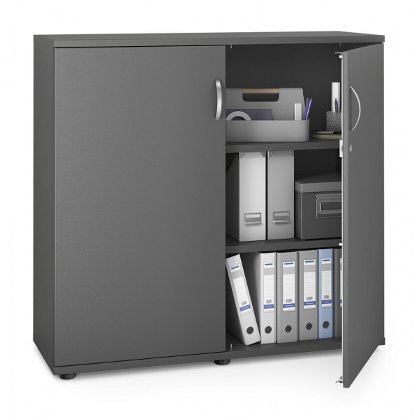 2x2 Fachböden höhenverstellbar, 30 kg Tragkraft/Fachboden, Flügeltüren abschließbar mit Schließdämpfung, Bügelgriff, Mitteltrennwand, Sichtrückwand, von innen einstellbare Möbelgleiter