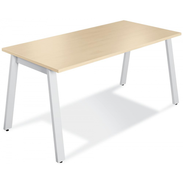 Die Tischplatte aus 3-Schicht-Qualitätsspanplatte mit Melaminharzbeschichtung in eleganten Ahorn-Farbtönen sorgt für eine ansprechende Optik und ist gleichzeitig pflegeleicht. Das stabile A-Fuß-Stahlgestell in der Farbe Weiß (RAL 9016) sorgt für einen sicheren Stand und unterstreicht das moderne Erscheinungsbild des Tisches.