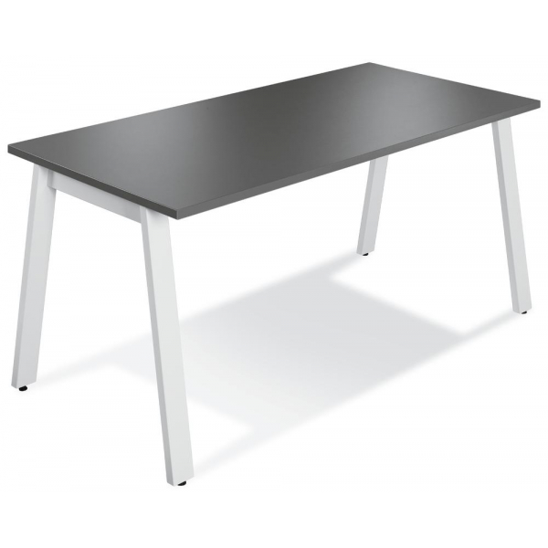 Die Tischplatte aus Holzdekor in stilvollem Anthrazit hat eine Plattenstärke von 25 mm und sorgt für eine robuste und langlebige Arbeitsfläche. Das A-Fuß-Stahlgestell in strahlendem Weiß (RAL 9016) verleiht dem Tisch einen modernen Look und ist zudem mit Bodenausgleichsschrauben ausgestattet, die eine Höhenverstellung von bis zu +10 mm erlauben, um Bodenunebenheiten auszugleichen.