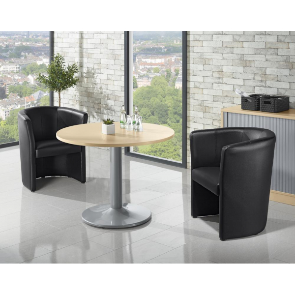 Der Konferenztisch MODUL von Deskin verbindet modernes Design mit funktionalen Eigenschaften. Mit einem Durchmesser von 1000 mm und einer Höhe von 735 mm bietet dieser runde Tisch Platz für bis zu 5 Personen. Die Tischplatte ist aus Holzdekor in Ahornoptik gefertigt, während das Gestell in einem eleganten alusilber (RAL 9006) pulverbeschichtet ist. Mit einem Gewicht von nur 28 kg ist der Tisch zudem leicht zu handhaben.