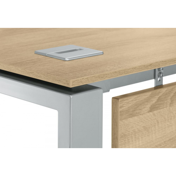 Der Schreibtisch Basic EVO von Deskin vereint modernes Design mit praktischen Funktionen. Die edle Tischplatte aus Wildeiche hat eine Stärke von 24 mm und ist mit zwei Kabeldurchlässen in Alusilber ausgestattet. Das stabile 4-Fuß Gestell in Alusilber (RAL 9006) sorgt nicht nur für eine ansprechende Optik, sondern auch für eine hohe Standfestigkeit.