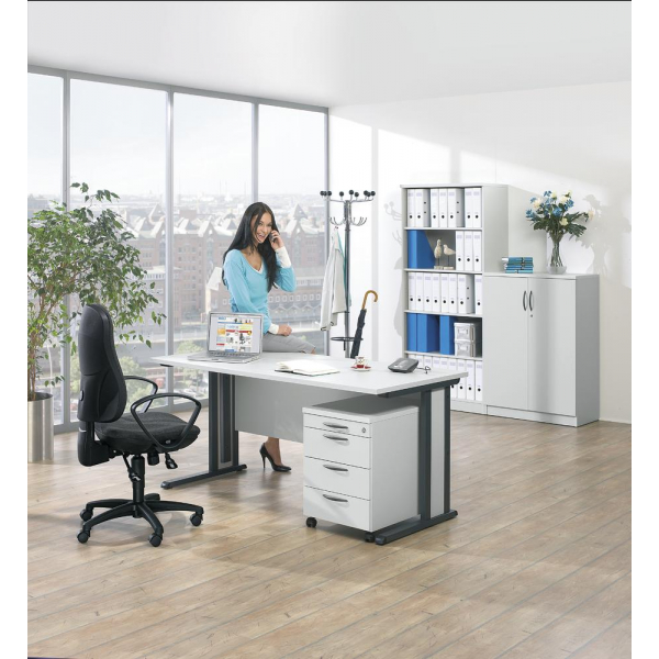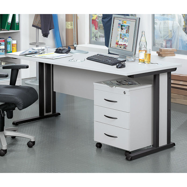 Das Büromöbelprogramm BASIC MULTI M erfüllt die hohen Anforderungen der europäischen Norm für Büromöbel (DIN EN 527 Teil 1 und Teil 2). Der Schreibtisch kommt inklusive Sichtschutzblende sowie horizontalen und vertikalen Kabeldurchführungen. Das stabil verschweißte C-Fußgestell sorgt für die nötige Stabilität.