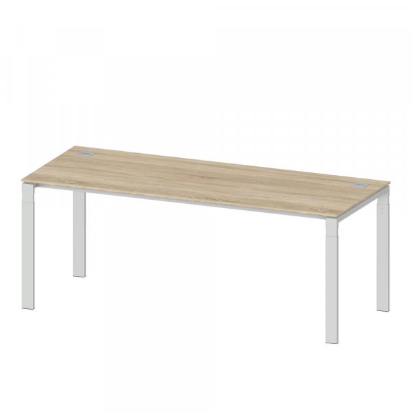 Die manuelle Höhenverstellung ermöglicht eine individuelle Anpassung der Tischhöhe von 73 cm bis 85,5 cm, sodass Sie ergonomisch arbeiten können. Mit einer Breite von 200 cm und einer Tiefe von 80 cm bietet der Schreibtisch ausreichend Platz, um auch mehrere Arbeitsgeräte oder Dokumente zu platzieren. Das stabile 4-Fuß-Gestell in Alusilber (RAL 9006) sorgt für einen sicheren Stand und unterstreicht das moderne Design.