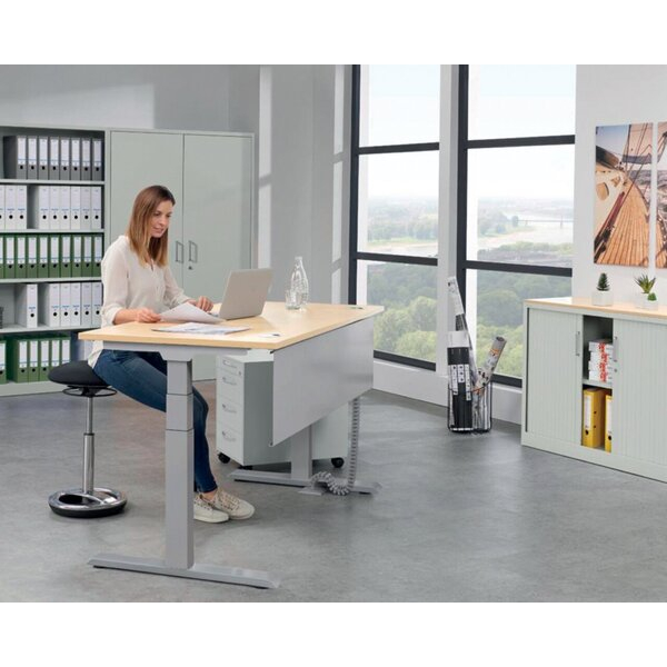 Der Schreibtisch FLEX MODUL, elektrisch höhenverstellbar, bietet Ihnen die perfekte Kombination aus Funktionalität und Design. Mit einer Höhenverstellung von 60,5-125,5 cm und einer großzügigen Fläche von 200x80 cm (BxT) ist dieser Schreibtisch ideal für jeden Arbeitsplatz. Die Kombination aus ahornfarbener Tischplatte und silbernem Gestell verleiht Ihrem Büro eine moderne Note.
