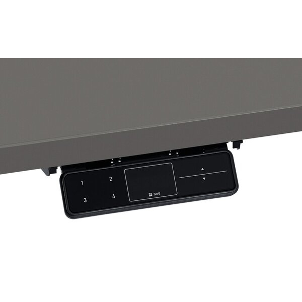 Der Schreibtisch ist elektromotorisch höhenverstellbar und bietet eine 25 mm starke Tischplatte mit zwei Metall-Kabeldurchlässen. Das T-Fuß Stahlgestell ist wahlweise in Alusilber oder Weiß erhältlich.