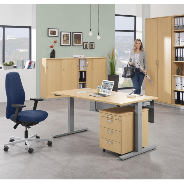 Der Schreibtisch T-Fuß MULTI M pro von Deskin vereint Funktionalität und modernes Design. Mit einer robusten Schreibtischplatte in Buchedekor und einer Stärke von 25 mm bietet dieser Tisch nicht nur eine ansprechende Optik, sondern auch eine stabile Arbeitsfläche. Das T-Fuß-Stahlgestell in Alusilber (RAL 9006) sorgt für eine elegante und zugleich robuste Unterstützung. Die manuelle Höhenverstellung ermöglicht es Ihnen, die Höhe des Tisches stufenlos zwischen 65 und 85 cm anzupassen, sodass Sie immer die optimale Ergonomie genießen können.