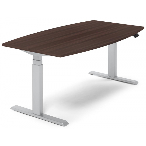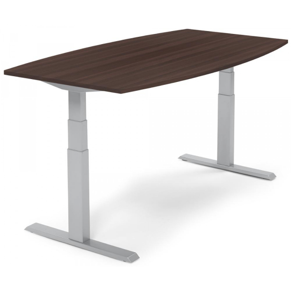 Deskin Sitz-Steh-Besprechungstisch, elektrisch höhenverstellbar 64-130cm (H), 200x100cm (BxT), 8 Personen, Tonnenform, nussbaum dunkel / silber