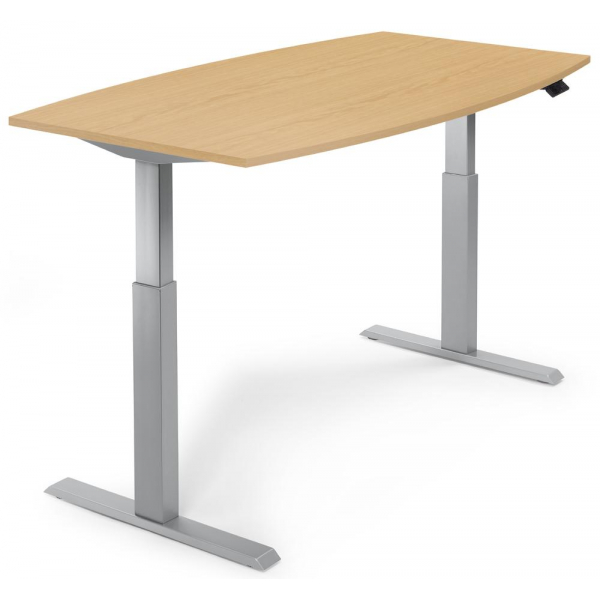 Deskin Sitz-Steh-Besprechungstisch, elektrisch höhenverstellbar 71,5-120,5cm (H), 200x100cm (BxT), 8 Personen, Tonnenform, buche / silber