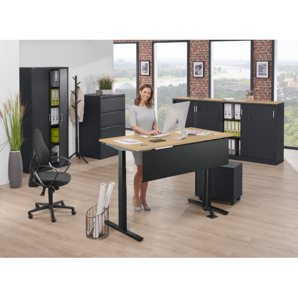 Das stabile T-Fuß-Gestell in Schwarz (RAL 9005) ist pulverbeschichtet und unterstützt eine dynamische Belastbarkeit von bis zu 100 kg. Mit den zwei synchron gesteuerten Elektromotoren und dem integrierten Kollisionsschutz, wird eine sichere und zuverlässige Nutzung garantiert.