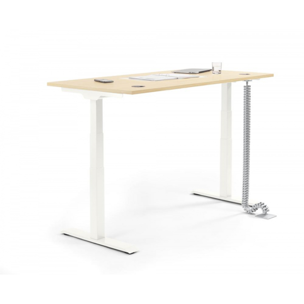 Der Tisch ist in einem eleganten Ahorndekor gehalten und verfügt über ein robustes T-Fuß-Stahlgestell in Weiß. Die 25 mm starke Schreibtischplatte ist mit 2 Kabeldurchlässen ausgestattet, sodass Sie Ihre Kabel ordentlich führen können. Dank der synchron gesteuerten Elektromotoren ist die Höhenverstellung besonders leise und komfortabel. Der Schreibtisch hat eine dynamische Belastbarkeit von bis zu 100 kg und wird inklusive einem praktischen Memory-Handschalter geliefert.
