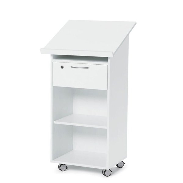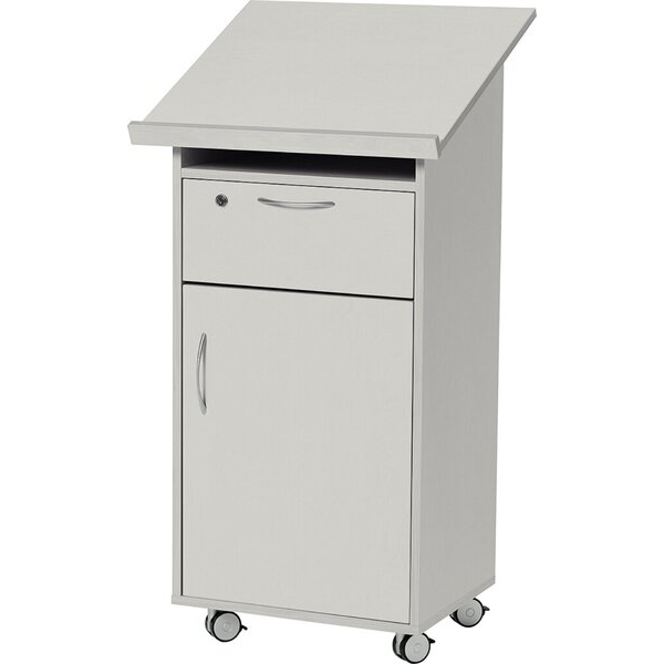 Das Pult ist wahlweise mit oder ohne Türe erhältlich und verfügt über eine Abrutschkante an der großen Manuskriptablage (B 600 x T 538 mm), die für einen sicheren Halt Ihrer Unterlagen sorgt. Dank der vier feststellbaren Laufrollen mit einem Durchmesser von 75 mm ist das Pult mobil und einfach zu bewegen.