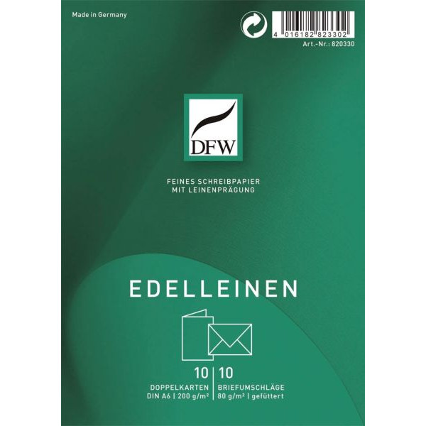 DFW Edelleinen - industriell gefertigtes Papier mit Leinenstruktur. Die Schreibpapier-Serie mit dezenter Leinenprägung für die anspruchsvolle Privatkorrespondenz vermittelt schlichte Eleganz und präsentiert einmal mehr die vielfältigen Möglichkeiten der Papiergestaltung. Edelleinen ist neben Meisterbütten eine exclusive Komponente der Standard-Schreibpapiere.